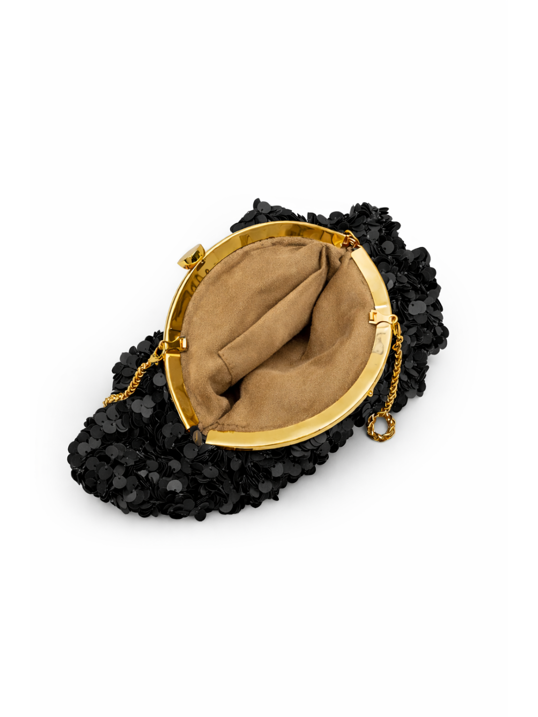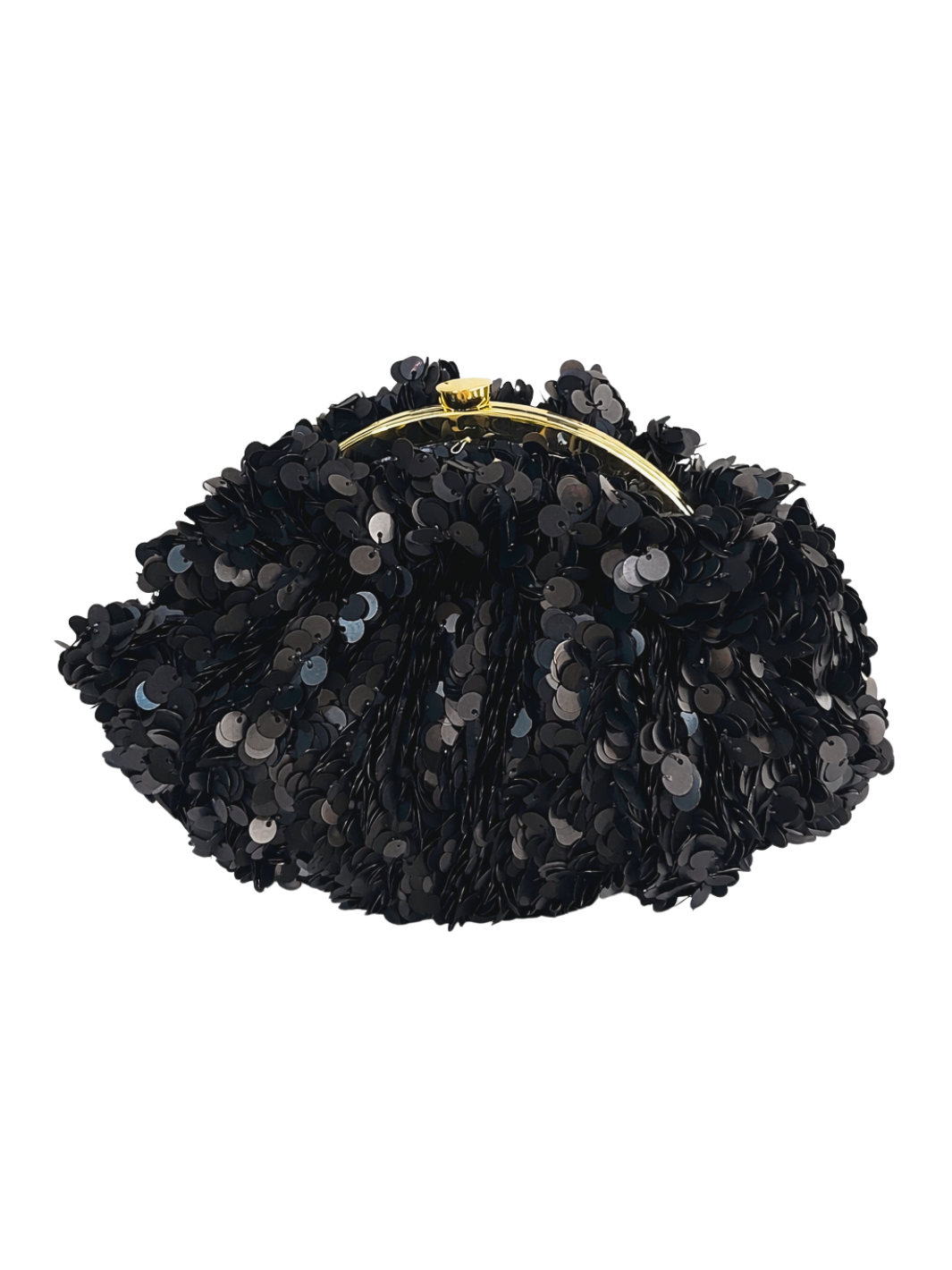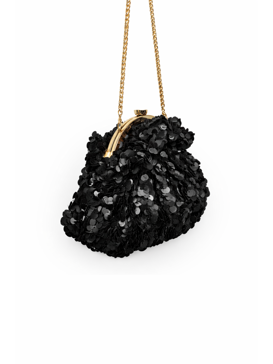 The Black Ice Starlit Pouchette Bag in a soft black sequin is a spacious design with a faceted frame and crystal embellished closure. This soft silhouette features a detachable strap, and can be worn as a clutch or on the shoulder.