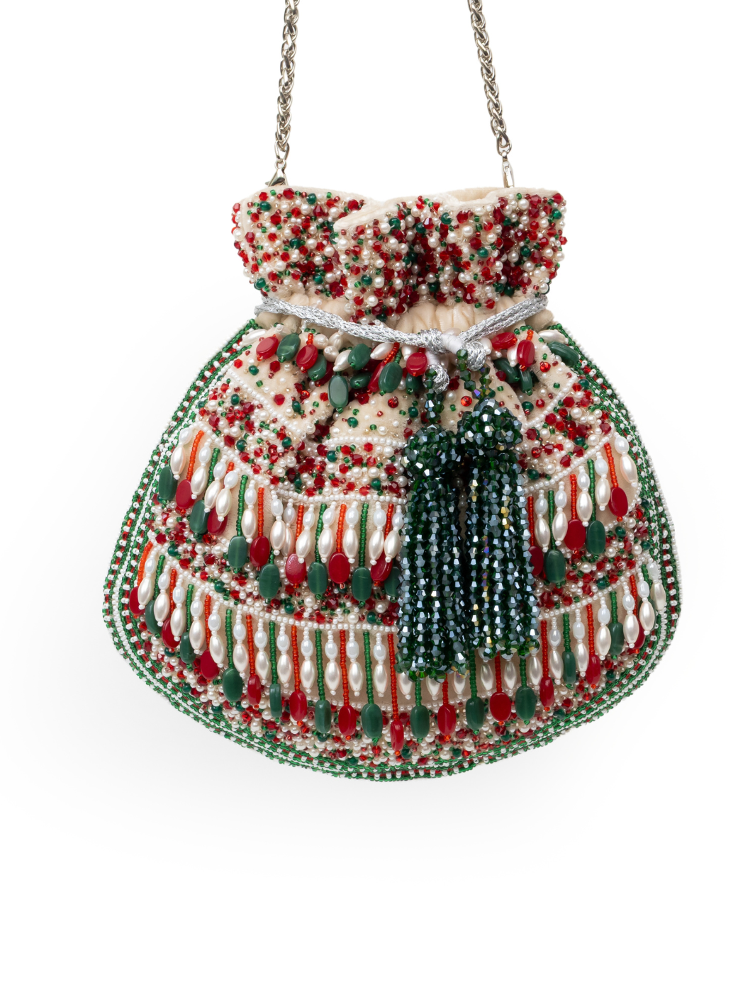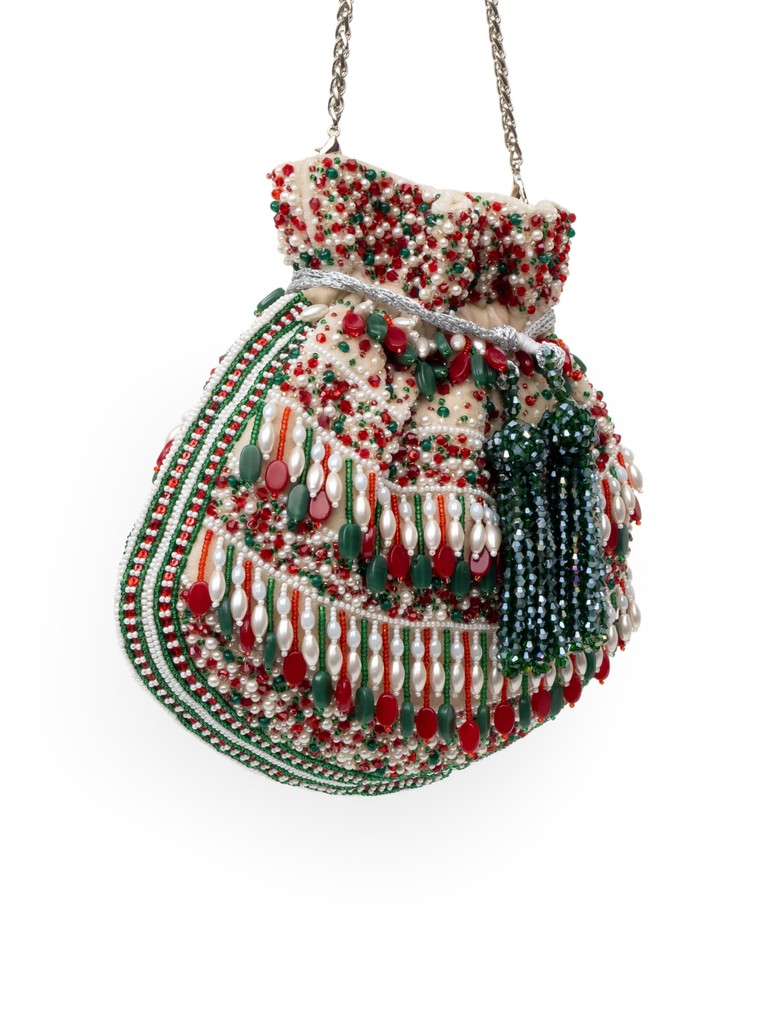 Emerald Muse is exquisitely crafted on a warm cream velvet base, lavishly hand-embellished with intricate micro seed beads and delicate pearl clusters. The striking traditional palette of red, deep green, and ivory weaves through its ornate pattern, creating a rich, regal finish. A prominent multi-strand dark green crystal tassel adorns the drawstring, while the structured circular base ensures a poised, sculpted silhouette — a true statement of timeless luxury. ✨